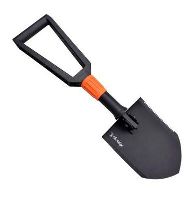 The Elk Ridge entrenching tool features a black carbon steel shovel head with serrated edge and a 3-way adjustable head for shovel, pick, and saw use. A 14.75" steel tube handle with nylon overmold ensures a solid grip. With a total length of 23", it folds for easy transport. Perfect for digging, cutting, or clearing during outdoor activities, survival scenarios, or emergency preparedness.