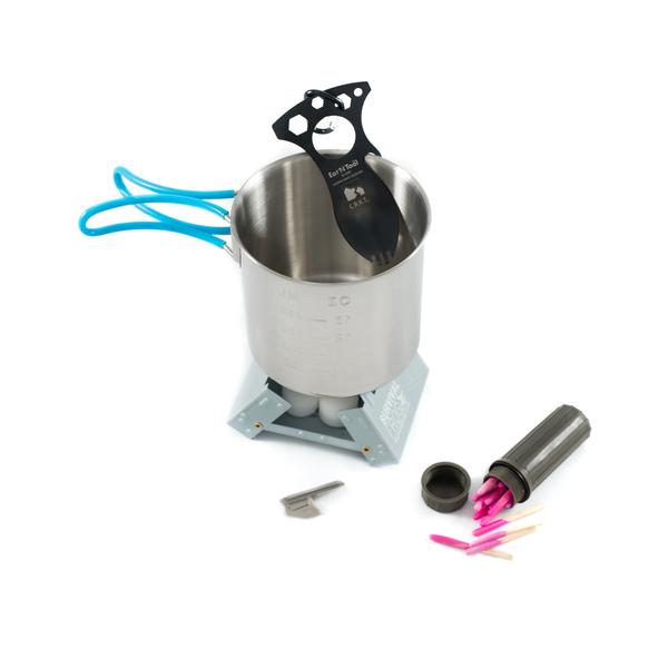 Includes: 1 - P-38 Can Opener 1 - Set of Waterproof Matches with Container 1 - Survival Frog Pocket Stove with Fuel Tablets 1 - Spork Survival Tool 1 - Stainless Steel Camping Cup 1 - Green Ripstop Fabric Bag w/ Drawstring & Clasp The Best Mess Kit For The Solo Traveler!