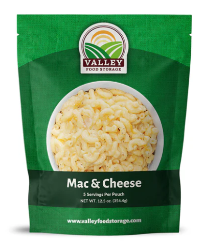 Valley Food Storage Mac and Cheese features a delectable blend of noodles and cheese based on a fantastic family recipe making it perfect for a quick and convenient lunch or dinner for the whole family. Each pouch of mac and cheese contains 5 servings.