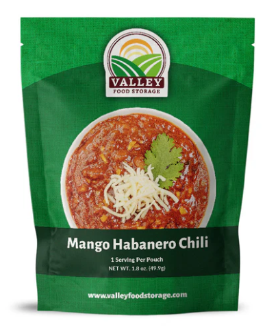 Valley Food Storage Mango Habanero Chili features a sweet and savory entree that will bring the heat to your kitchen making it perfect for a quick and convenient lunch or dinner for the whole family. Each pouch of mango habanero chili contains 5 servings.