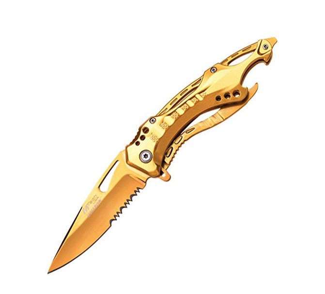 Spring assist folding knife offers rapid one-handed deployment, locks securely into place with liner lock Stainless steel half-serrated blade with gold titanium coating Gold titanium-coated aluminum handle Comes complete with a pocket clip for easy and safe carry; includes bottle opener and glass breaker 4.5-inch closed length; 3.75-Inch blade length with 3 mm thickness