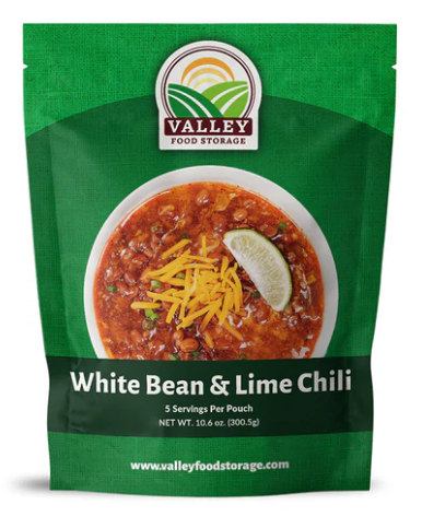 Valley Food StorageWhite Bean and Lime Chili features a thick and savory mild chili mixed with Great White Northern Beans, Pinto Beans, an assortment of vegetables and a hint of lime making it perfect for a quick and convenient lunch or dinner for the whole family. Each pouch of white bean & lime chili contains 5 servings. ✔︎ Simple Ingredients ✔︎ Non-GMO ✔︎ Easy To Prepare ✔︎ 25-year Shelf Life