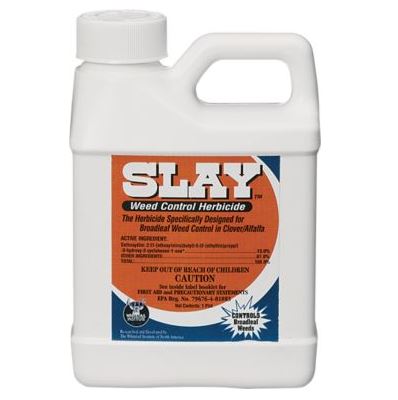 Slay Herbicide is a highly concentrated herbicide that controls broadleaf weeds in food plots. Reduces weed and grass competition for soil nutrients, moisture and root space to maximize growth and extend production years. Apply by hand, four-wheeler and tractor sprayers. (See label for proper application.) Slay can be applied to legumes, i.e. clover and alfalfa. (See label for complete listings.)